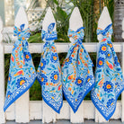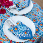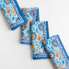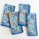 Inspired by the patterns of painted tiles found throughout Turkey, this print celebrates flower buds and blossoms in rich blues and vibrant yellows and oranges. These napkins are edged with a scalloped pattern in two shades of blue with a rambling vine and delicate leaves.