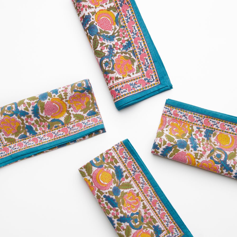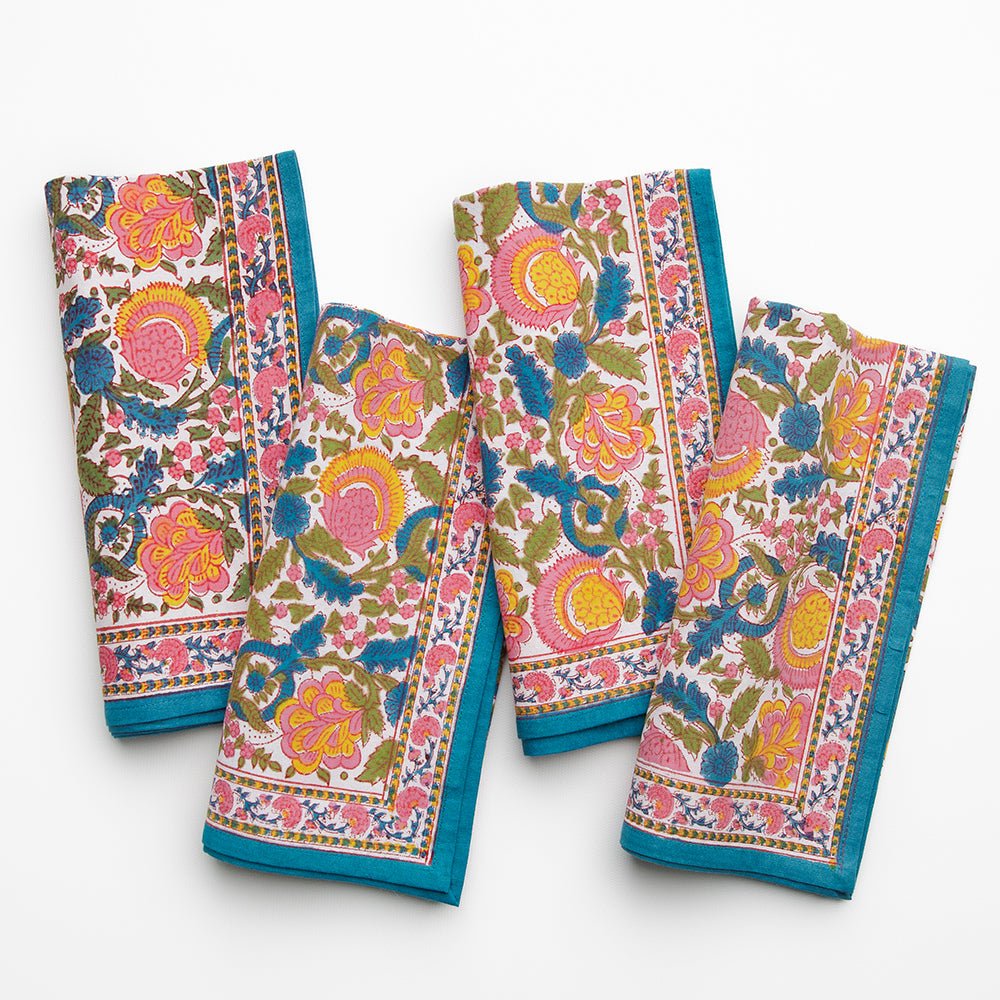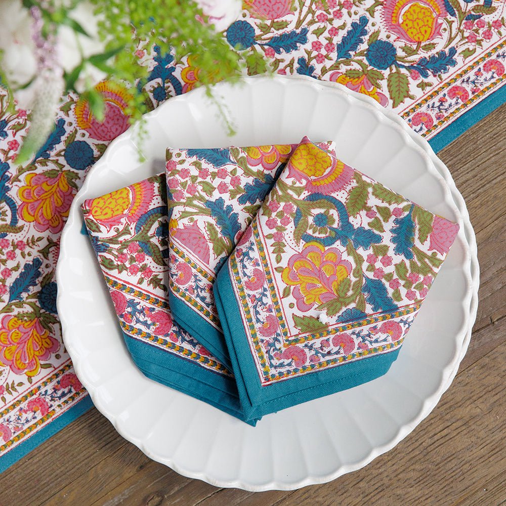 Colorful and vibrant, these boho blooms are the perfect spring/summer staple. Our multi jewel toned floral block printed cotton napkins are the perfect addition to a modern, boho chic home. Effortlessly brighten up your everyday table with Pomegranate's refreshing yellow, pink, teal and green floral napkins. Complete the set with matching placemats, table runner, and tablecloths or mix with other prints in our exclusive blossoms collection.