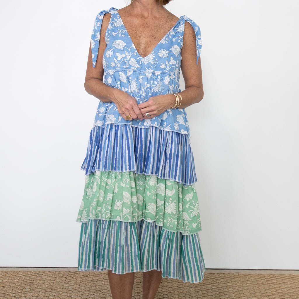 Light and graceful, the Morning Meadow Blue Layered Ruffle Midi Dress brings a soft sense of movement with every step. The tiered skirt combines floral and stripe patterns in a fresh coastal palette, creating a look that feels playful yet refined. Adjustable tied shoulder straps and a gentle V neckline add an easy feminine touch. A breezy warm weather favorite that delights in both color and style.