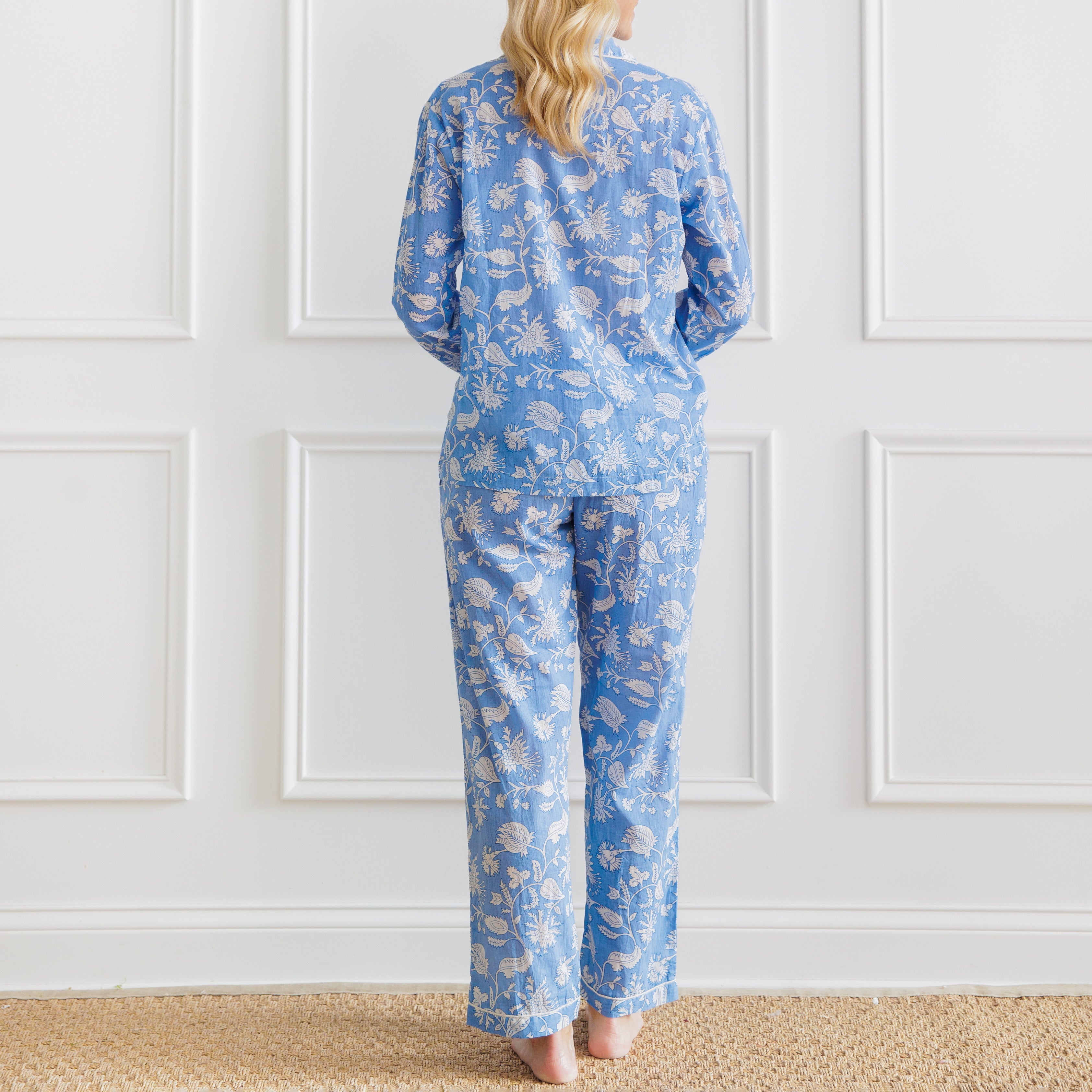 This pajama set, featuring a soft blue hue with a delicate botanical print is the perfect evening loungewear. Made from cozy 100% cotton, this set will allow you to relax in style. The button-down top with a notched collar and piped detailing pairs effortlessly with the pants, complete with an elastic waistband for added comfort. With pockets on both sides, this pajama set is as practical as it is stylish, making it a lovely choice for anyone who values both comfort and style in their loungewear.