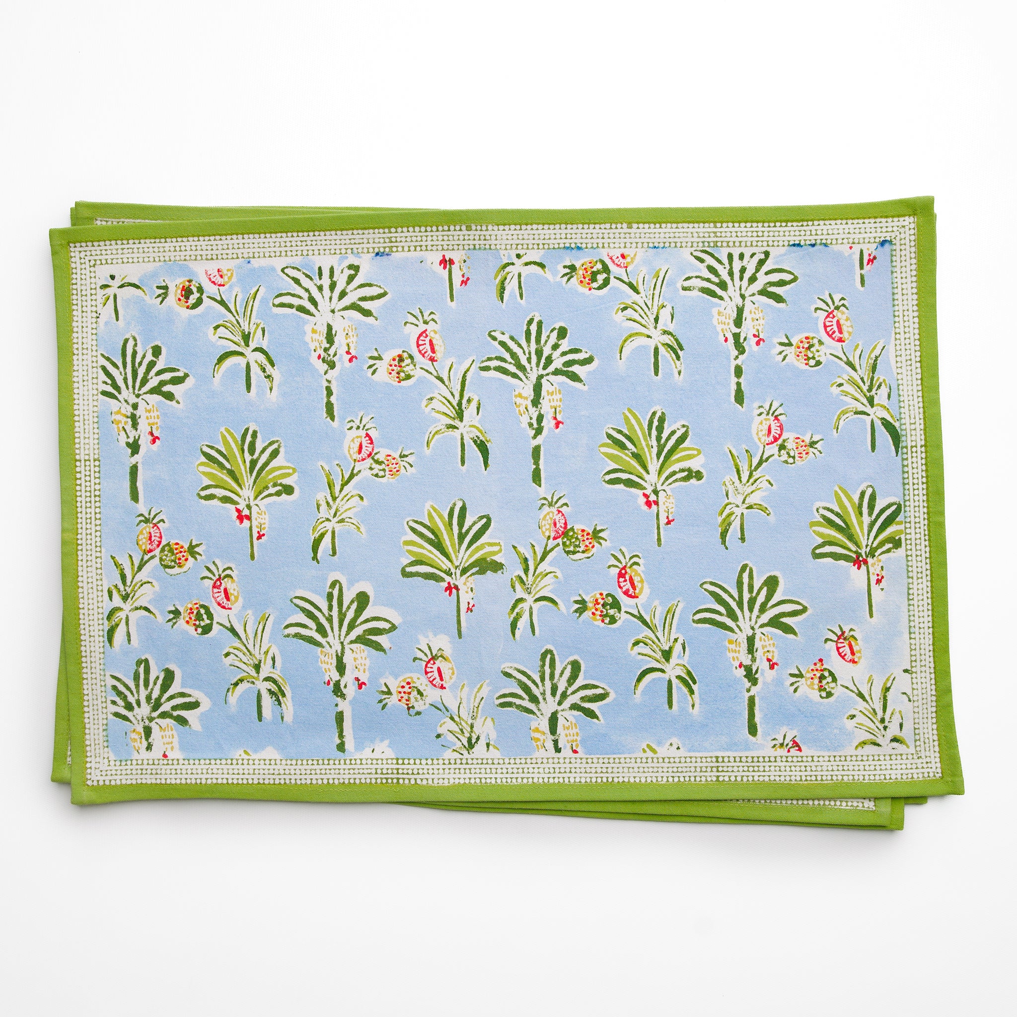 Tropical island palms and pineapples adorn this coastal themed light blue and green Pomegranate hand block printed cotton placemat. Complement your breakfast, lunch and dinner table with these refreshing and original table linens. Pair with matching napkins, table runners and tablecloths to complete the coastal look.