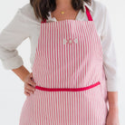Introducing our delightful Peppermint Apron, a kitchen essential that adds a playful touch to your culinary adventures. This charming apron features classic red and white stripes, reminiscent of a candy cane, and boasts an intricately embroidered peppermint on the chest.
