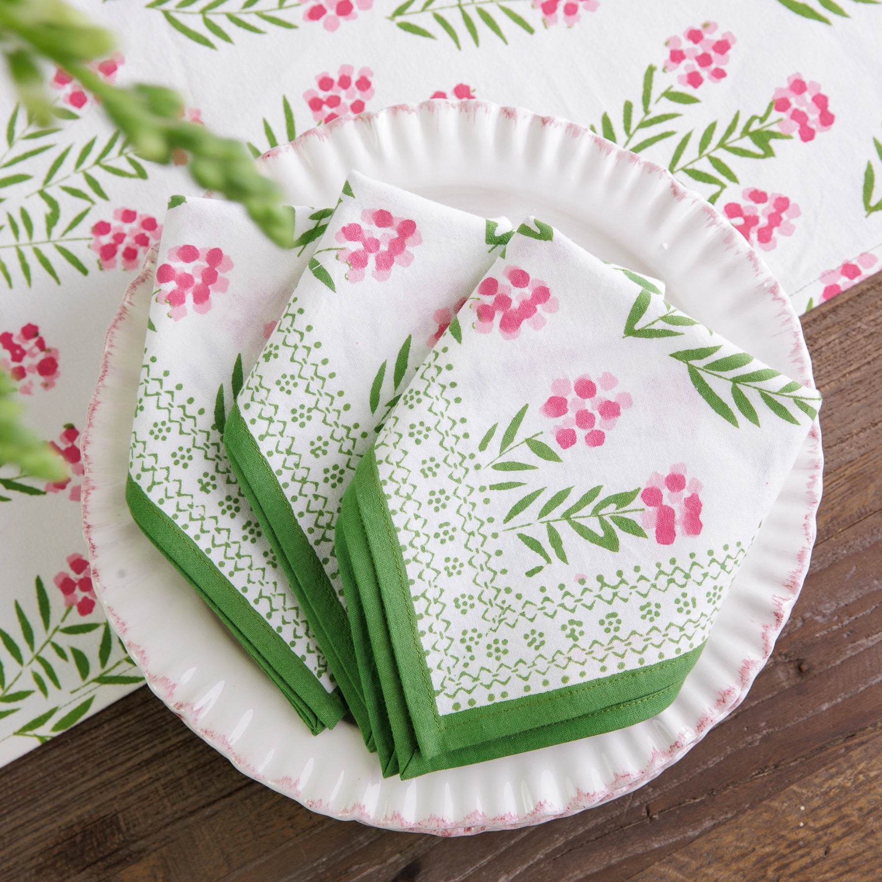 Phlox Pink napkins pair beautifully with Pomegranate Green or Rose ceramics and natural textures like bamboo and rattan.