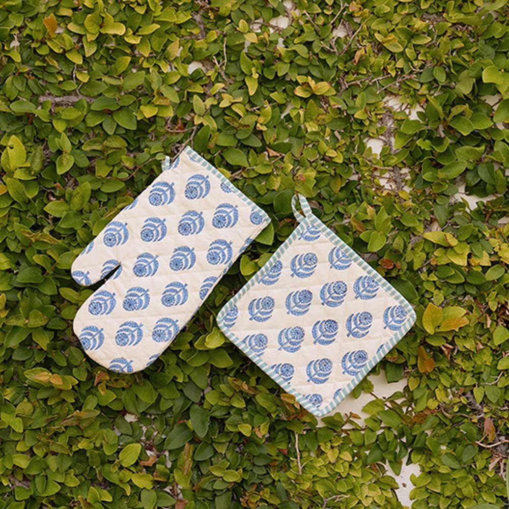 Our latest exclusive periwinkle blue and white print is refreshing yet cool, traditional and exotic, all at the same time. Cheer up your kitchen with this unique blue and white oven mitt set.