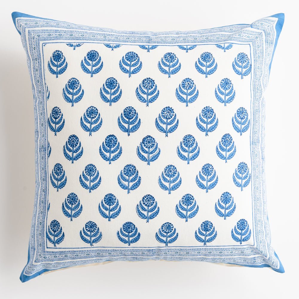 The Pinot Pillow Cover brings effortless elegance to any room with its refreshing blue floral motif, originally hand-painted and then hand-block printed by artisans. Crafted from soft cotton, each pillow cover showcases intricate detailing and a crisp border that enhances its refined, globally inspired style. Available in multiple sizes for easy layering—from sofas and reading chairs to outdoor seating and bedroom ensembles. Mix and match for a perfectly styled, artisan-crafted look.