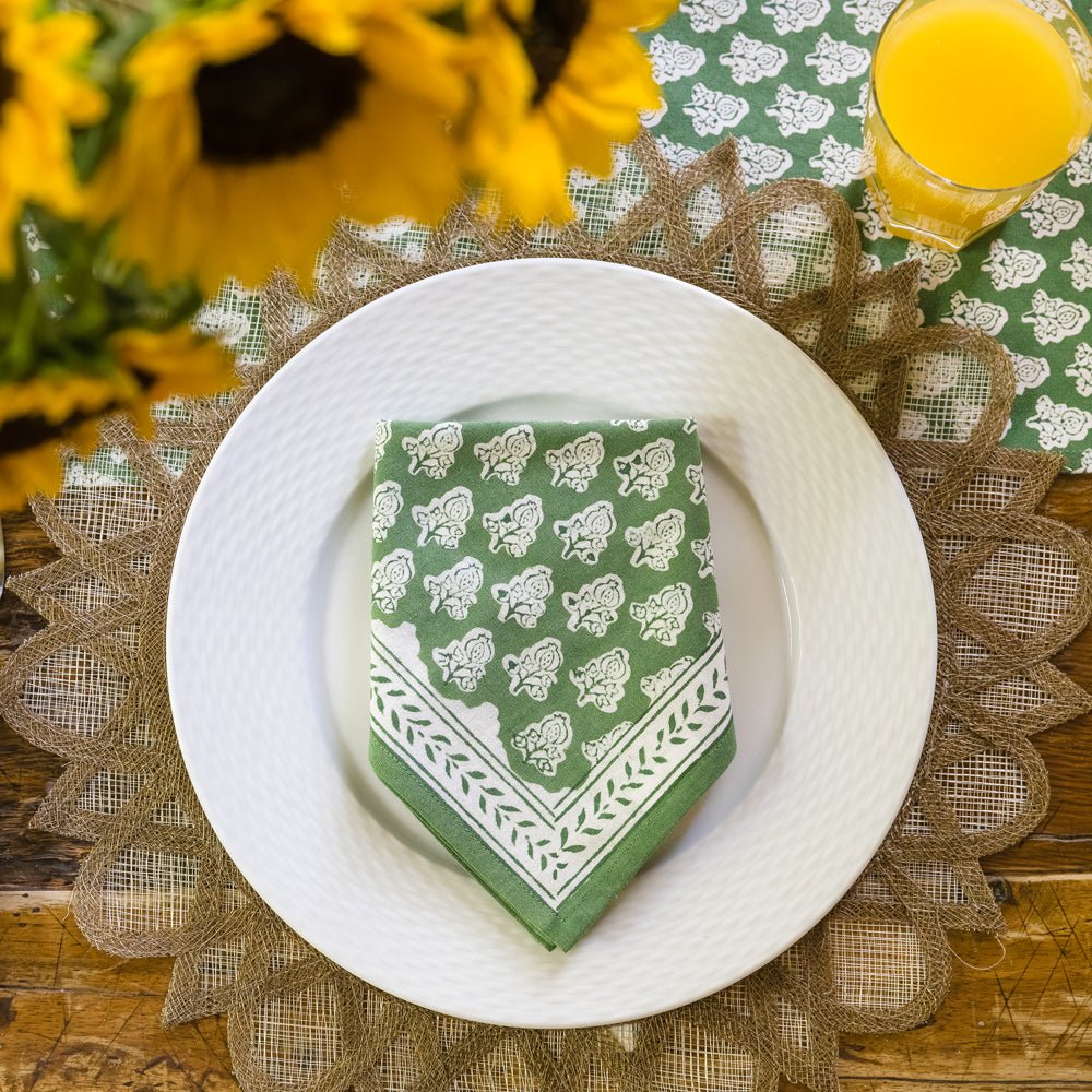 Our Pom Buti Green Napkins are a captivating blend of alluring nature and classic poise. The lush green background is adorned with dainty white florals offering exquisite harmony and making them an adaptable addition to your table linens collection.