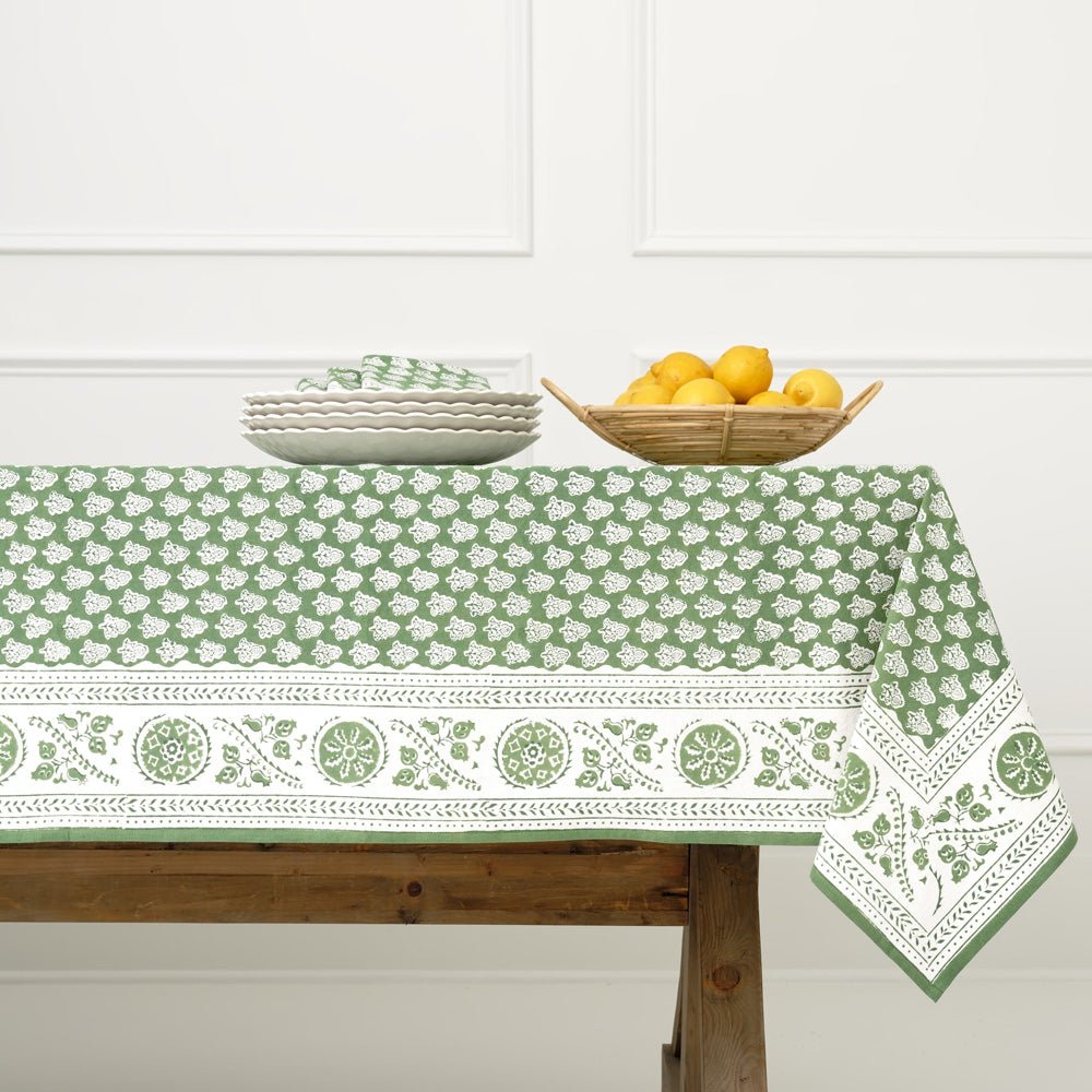 Transform your dining area into a canvas of elegance with our Pom Buti Green tablecloth. This captivating masterpiece is destined to be the focal point of your table, setting the stage for memorable gatherings with family and friends. Its lush green fabric, graced by a delicate white floral pattern, embodies a perfect fusion of sophistication and simplicity, making it an indispensable addition to your collection of table linens. Whether you're hosting an intimate dinner or a grand feast, this tablecloth ensures that every meal is accompanied by an aura of timeless charm, creating a warm and inviting atmosphere that leaves a lasting impression on all who gather around your table!