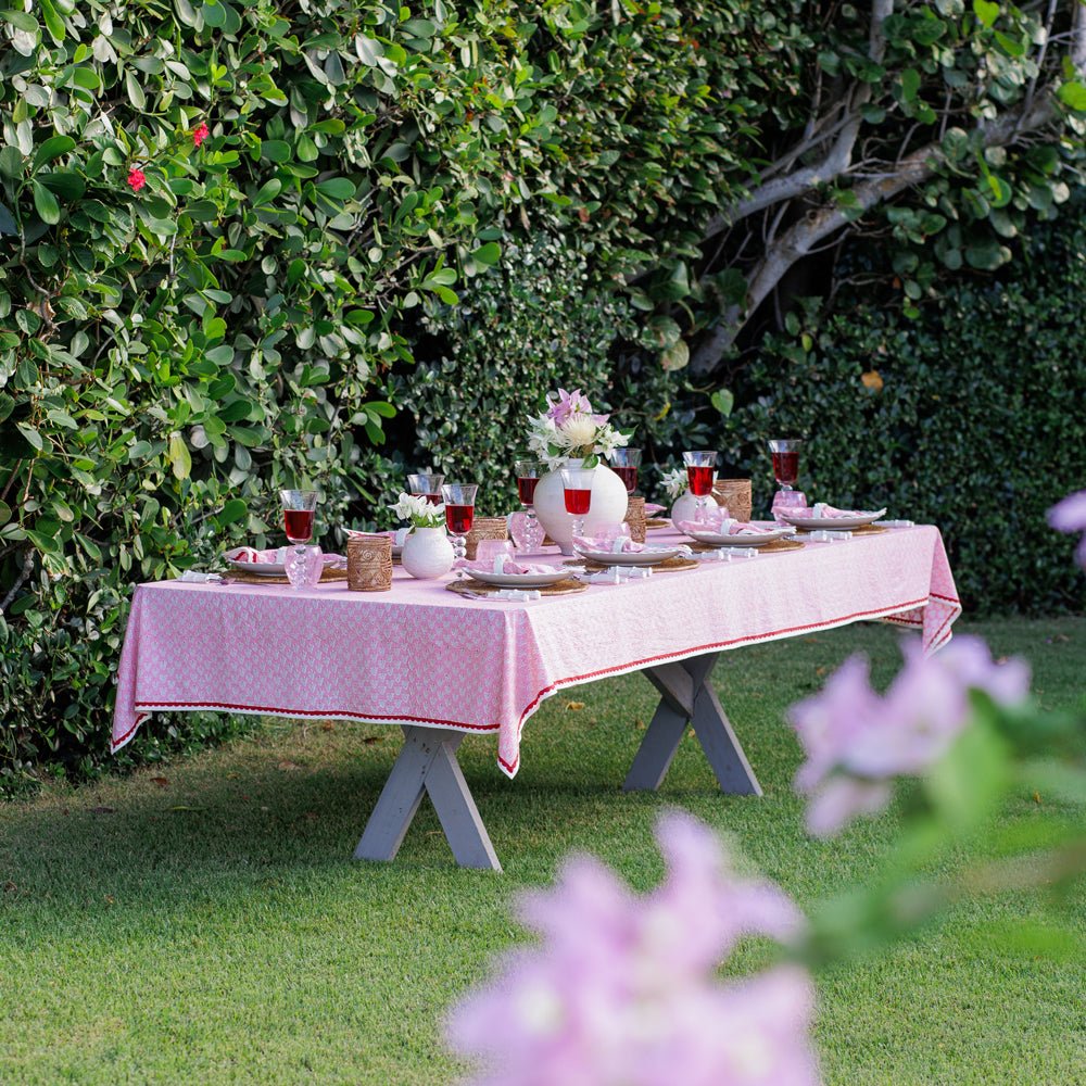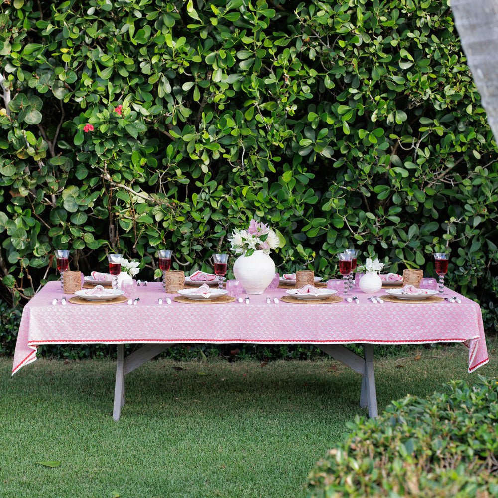 Transform your table into a celebration of color with our Pom Buti Pink Tablecloth. This hand block-printed piece showcases a charming floral motif against a soft pink background, framed by a red scalloped border. Perfect for entertaining or simply elevating everyday dining, this tablecloth is a must-have for creating a warm and welcoming atmosphere.