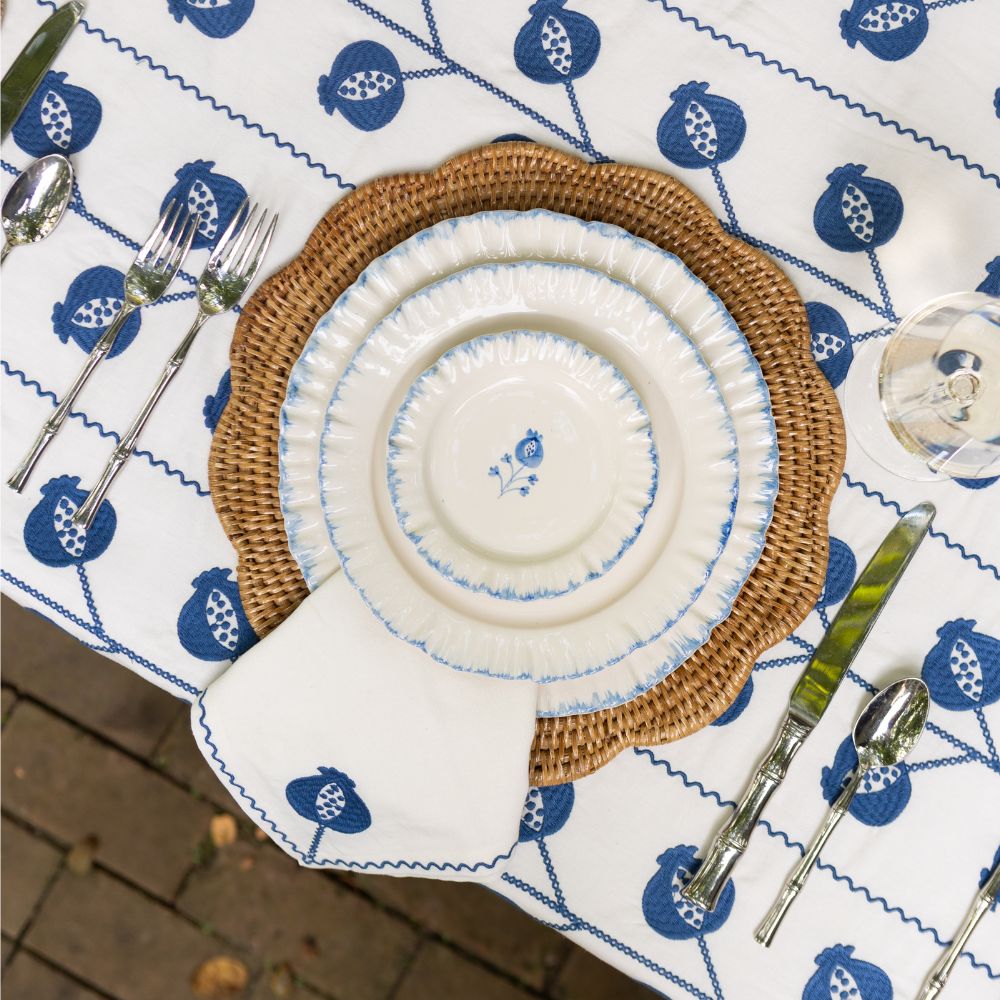 Classic and serene, this blue crewel embroidered tablecloth captures coastal-inspired elegance with a timeless twist. The floral embroidery adds depth and refinement to soft cotton, creating a versatile foundation for gatherings both casual and formal. Its cool tones pair beautifully with crisp whites, rattan, or gold accents for a polished yet relaxed tablescape.