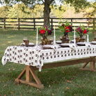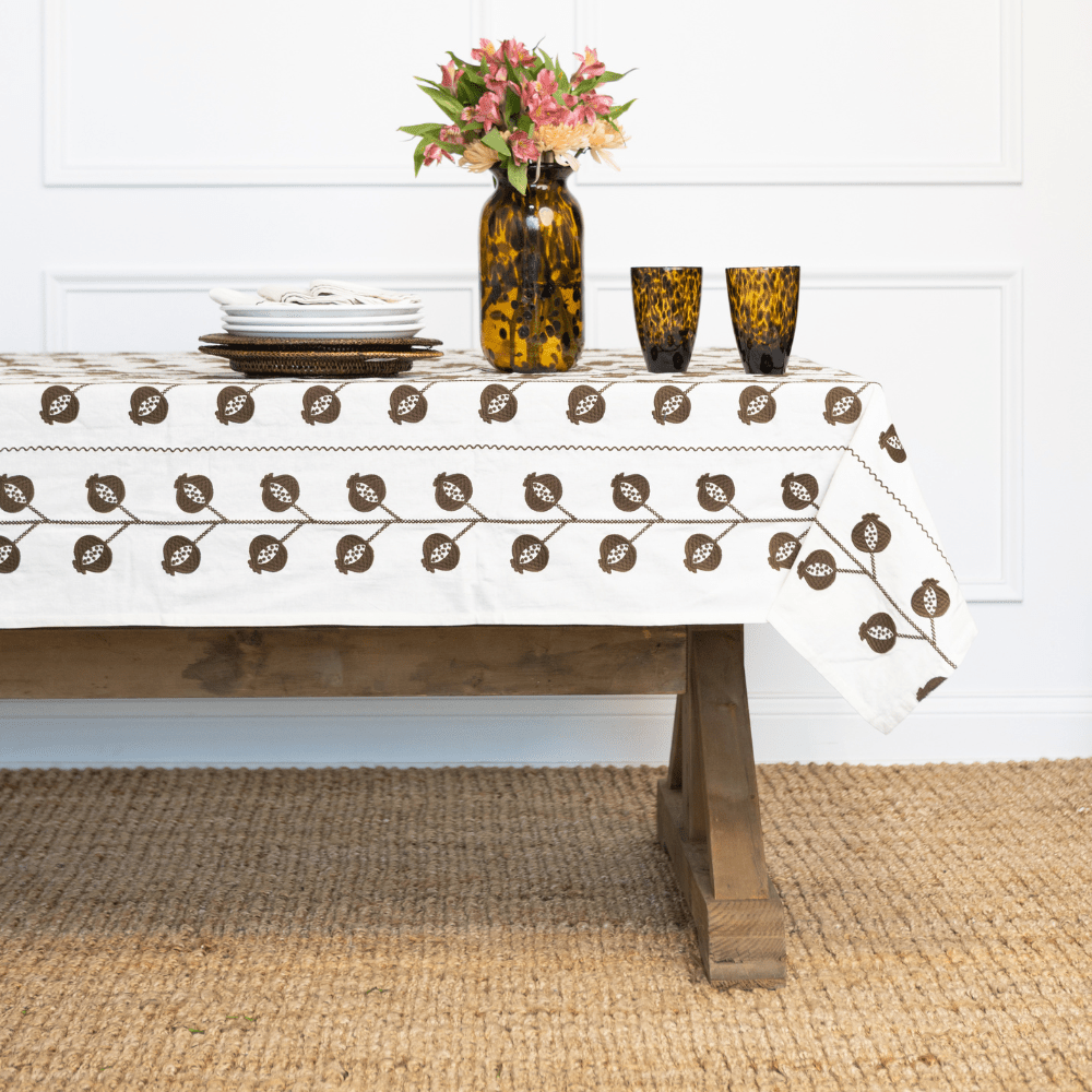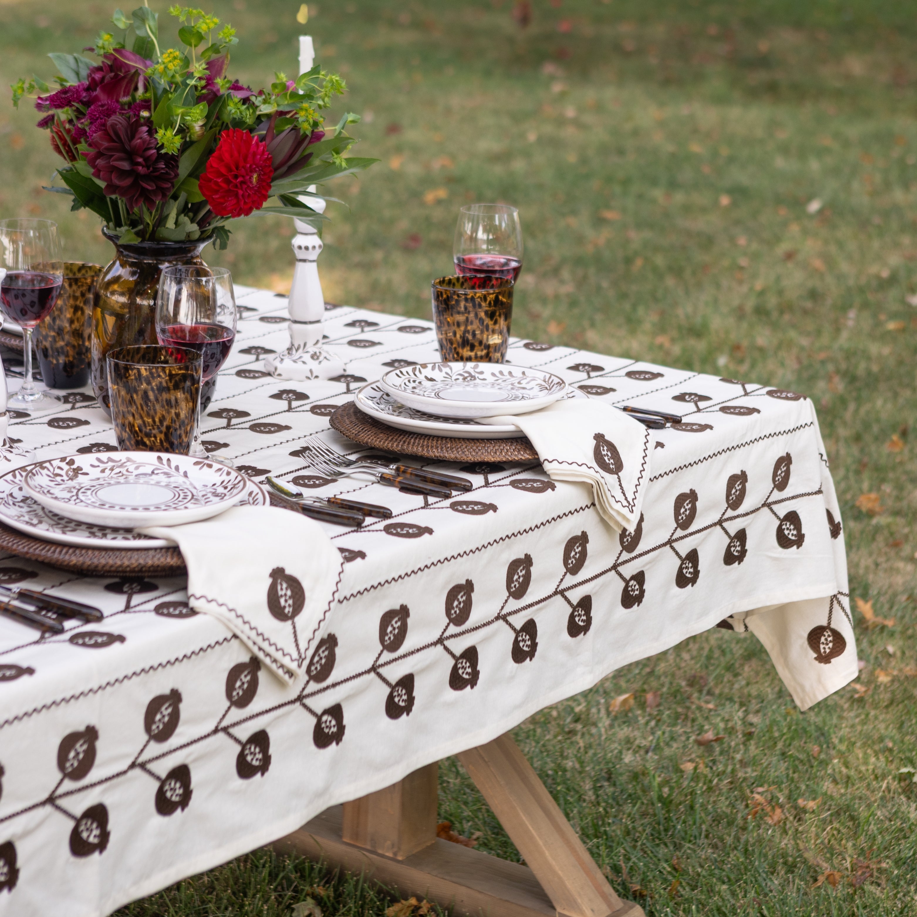 Earthy and elegant, this brown crewel embroidered tablecloth brings warmth and character to your dining space. Crafted from soft, durable cotton, it features intricate floral embroidery inspired by traditional crewelwork techniques. The tonal stitching adds subtle dimension and texture, making it a beautiful foundation for both casual gatherings and formal dinners. Its rich, neutral hue layers easily with patterned napkins, woven placemats, and natural centerpieces for a timeless, inviting table.