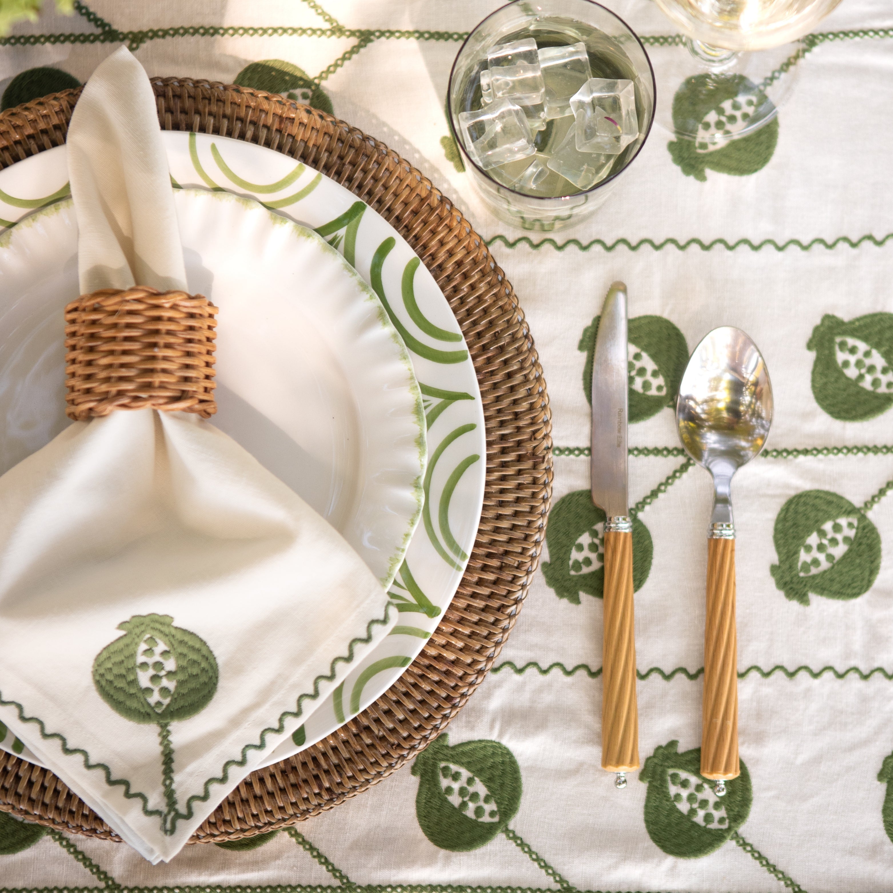 Delicate green embroidery adorns these cotton napkins, giving them a fresh yet refined character. Their subtle floral motifs add dimension and polish, ideal for both everyday meals and festive entertaining. Pair with natural textures or matching embroidered pieces for a cohesive, elegant table.