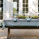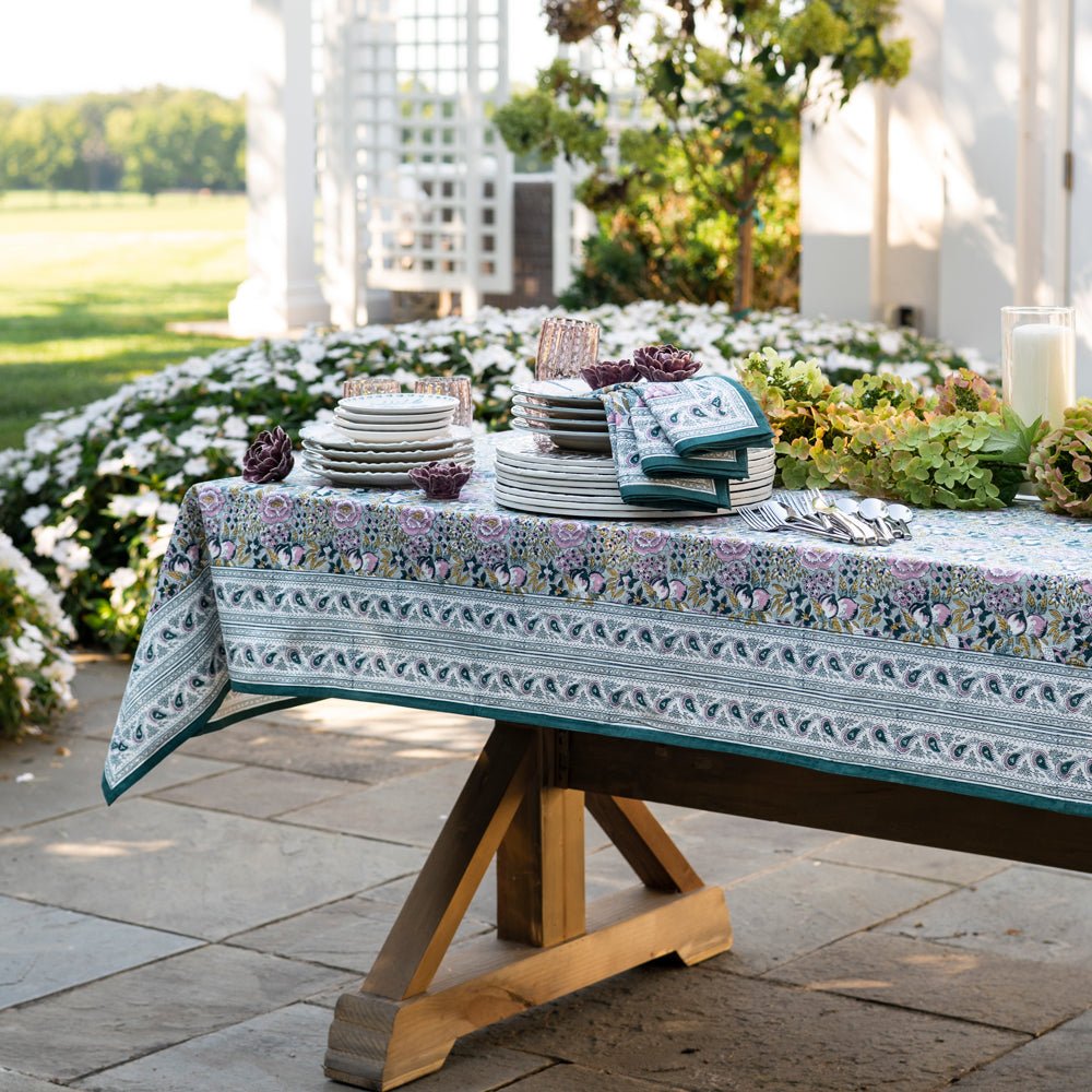 Set the stage for memorable meals with the Pomegranate Garden Teal & Lilac Tablecloth. This stunning hand-block printed tablecloth features a floral motif in serene lilac tones, contrasted against a teal background. Made from 100% cotton, it is machine washable and perfect for adding a touch of elegance to any dining experience.