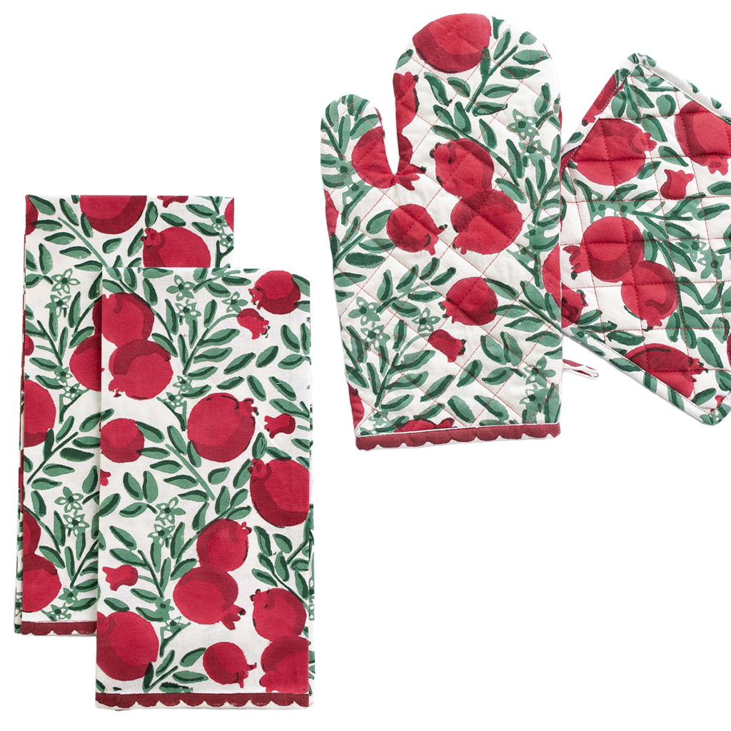 Refresh your kitchen with the artisanal charm of our Pomegranate Vine Kitchen Essentials Bundle, a coordinated set designed to bring beauty and function to everyday routines. Hand block printed by skilled artisans in India, each piece features our signature Pomegranate Vine motif, where winding branches, vibrant berries, and layered botanical details are stamped onto soft cotton using carved wooden blocks. The result is a pattern full of depth, texture, and the subtle variations that make hand printed textiles so treasured.