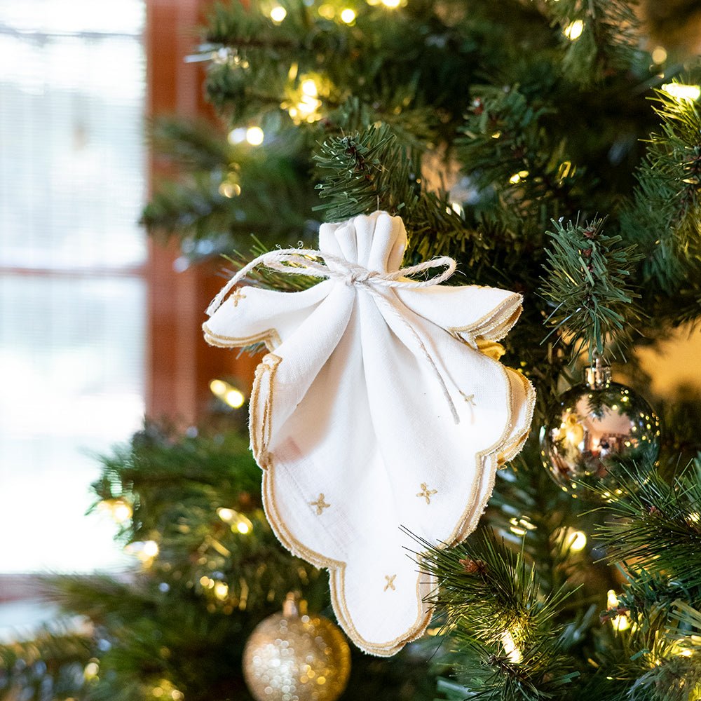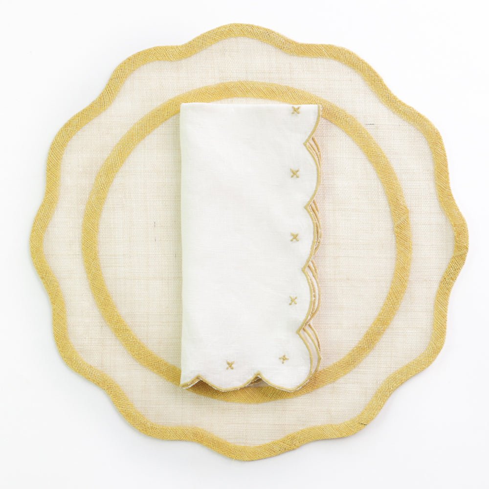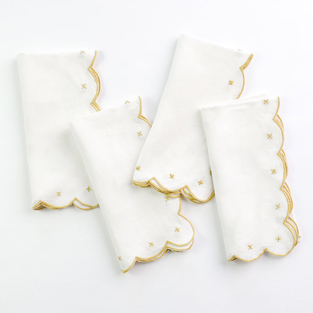 Elevate your dining experience with our Scalloped Knot Linen Napkin Set. Crafted from soft, white linen, each napkin features a delicate embroidered design and a stunning scalloped edge in a rich golden yellow hue. Add a touch of elegance and sophistication to your table setting with this set of 4 napkins.
