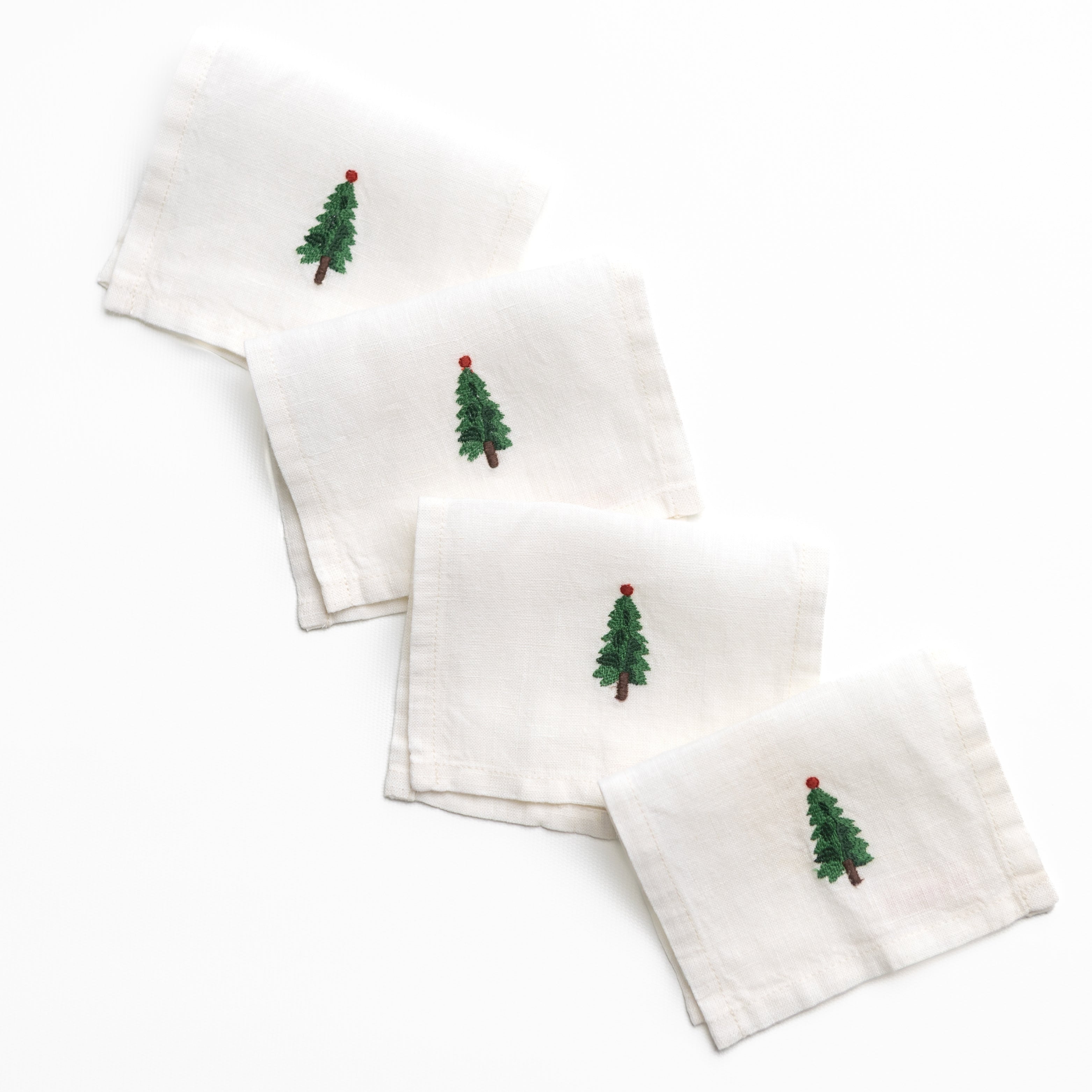 A charming addition to holiday gatherings and winter entertaining, these linen cocktail napkins feature finely embroidered green fir trees that bring nature’s beauty to your bar cart or hors d’oeuvres table. Crafted from natural linen with a refined hand-feel, they add warmth and whimsy to every toast, from casual cocktails to festive soirées.