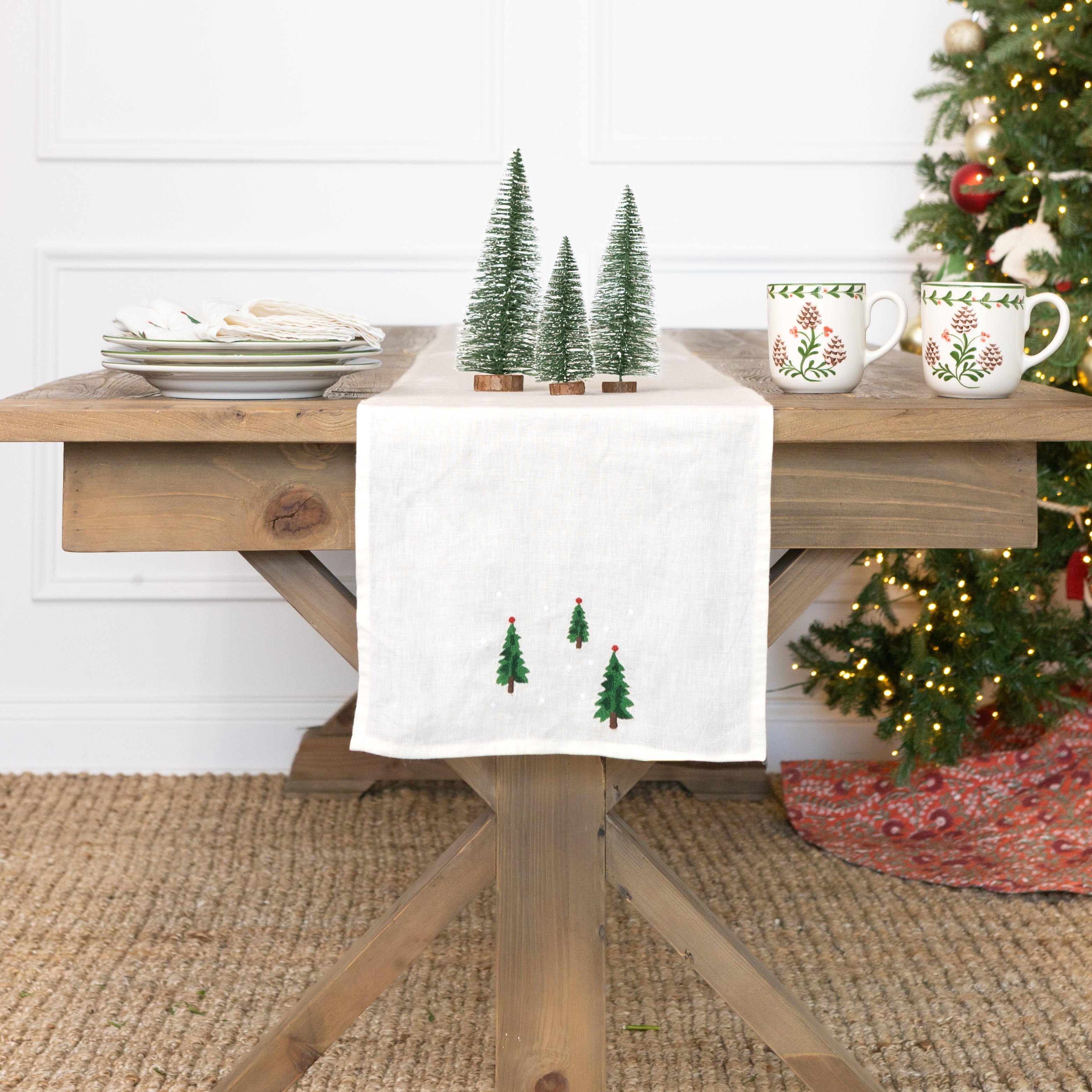 Embrace the elegance of winter simplicity with the Slope Firs embroidered table runner. Made of soft, breathable linen, this runner is embroidered with graceful green fir trees that evoke the serenity of alpine landscapes. Its clean, natural background lets the embroidery stand out beautifully—making it an ideal layering piece for festive tables or relaxed winter meals.