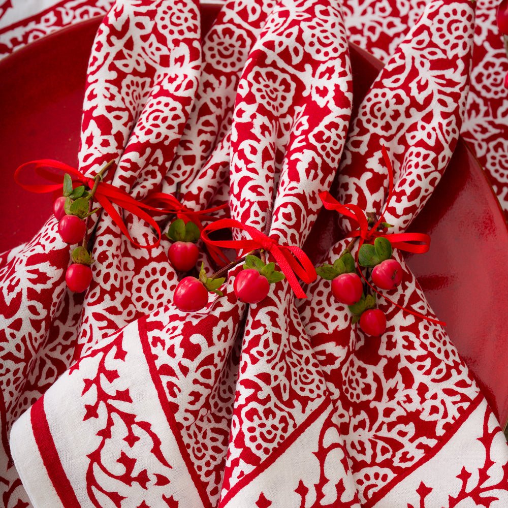 This Tapestry Deep Red napkin, a traditional block-printed design in red and white, is intended to represent the weaving of stories that are part of meals with family, friends, and guests. Its beauty highlights the importance of the details, and helps create a narrative of your entertaining experiences.