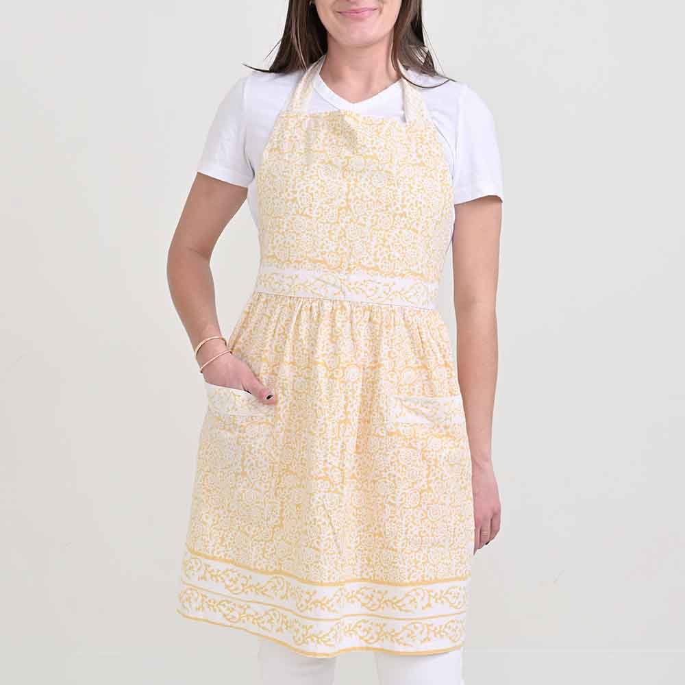 This updated traditional classic yellow and white hand block printed Tapestry Marigold Apron was designed to symbolize the weaving of stories that are shared during meals. Explore ingredients in an apron that reminds us of the beauty of details and encapsulates the tapestry of your entertaining.
