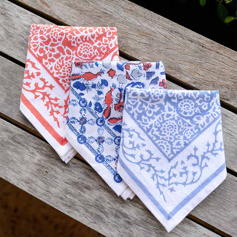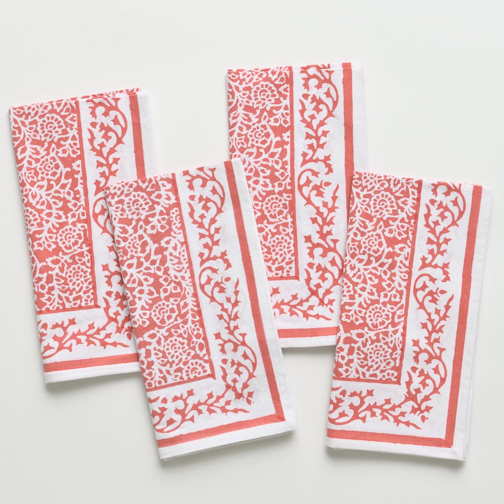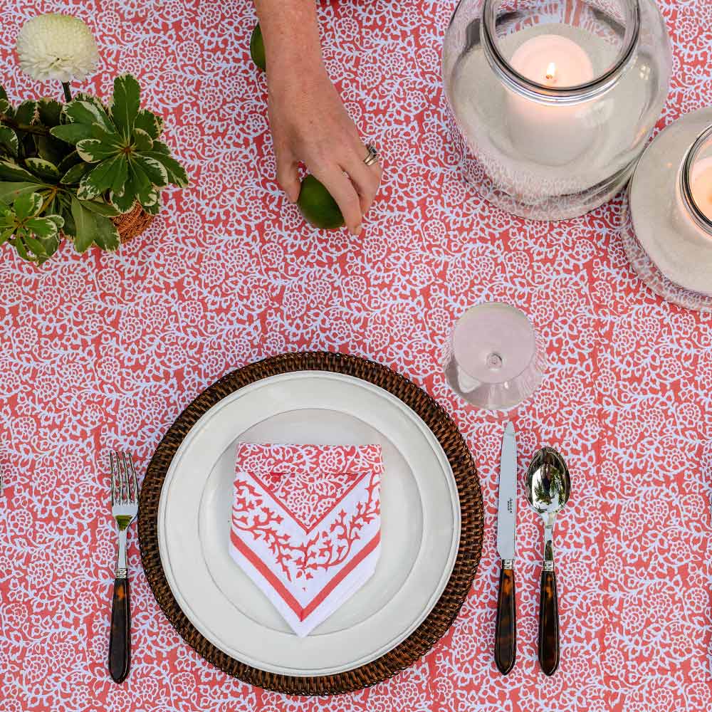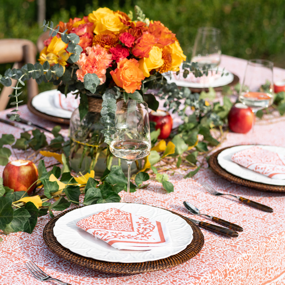 This updated traditional classic red and white hand block printed Tapestry Persimmon napkin was designed to symbolize the weaving of stories that are shared during meals. Explore conversations with family, friends, and guests that remind us of the beauty of details and encapsulates the tapestry of your entertaining.