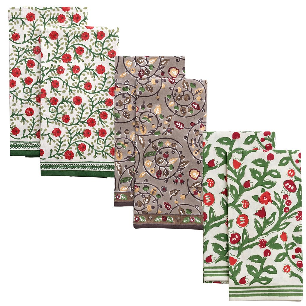 Refresh your kitchen for the season with our Winter Tea Towel Set, a curated collection of three hand block printed designs that bring warmth, color, and artisan charm to everyday tasks. The set includes one towel each in Acorn and Berries, Emma Red and Green, and Stephanie Red and Green, all crafted by skilled artisans in India using traditional carved wooden blocks. The result is a trio of richly detailed patterns, each with the soft variations and character that make hand printed textiles so special.